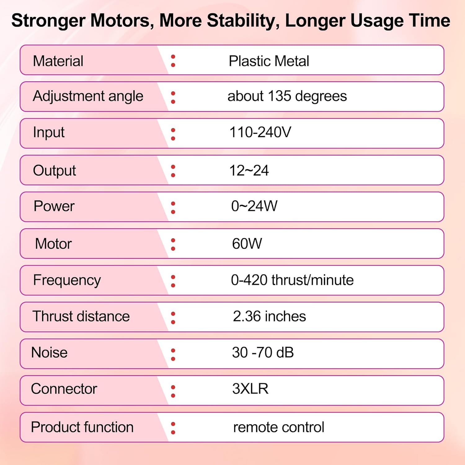 - Thrusting Speed: Adjustable speeds ranging from 0 to 420 strokes per minute.