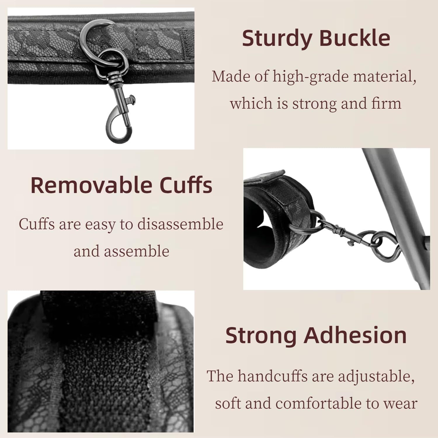 - Cuffs: Four adjustable, soft-lined cuffs (two for wrists, two for ankles) for a comfortable yet secure fit.